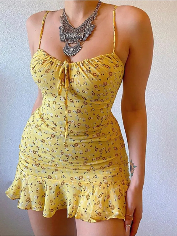 Turn heads this summer with our Floral Bodycon Summer Mini Dress. Featuring a figure-flattering bodycon fit, this spaghetti strap sundress combines comfort and style effortlessly. The delicate floral print and ruffled hem add a touch of femininity, making it perfect for beach outings, brunch dates, or night events. Designed for the modern woman, its lightweight and breathable fabric ensures all-day comfort. Whether you're strolling on the sand or dancing under the stars, this sleeveless fashion mini dress will keep you looking stunning.