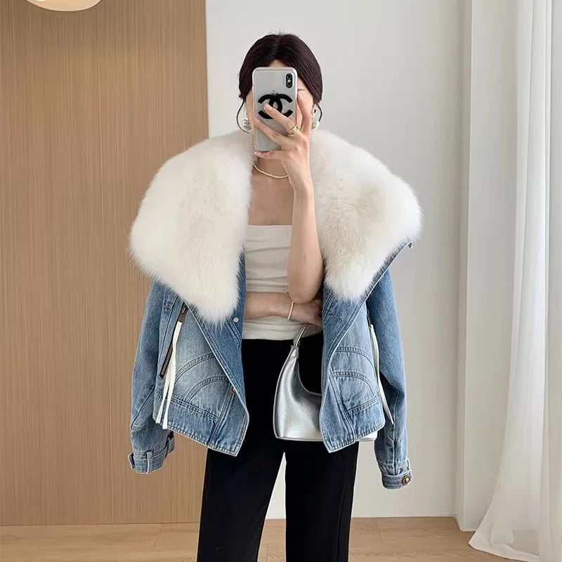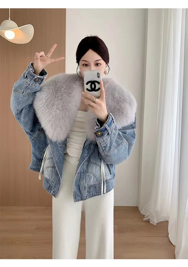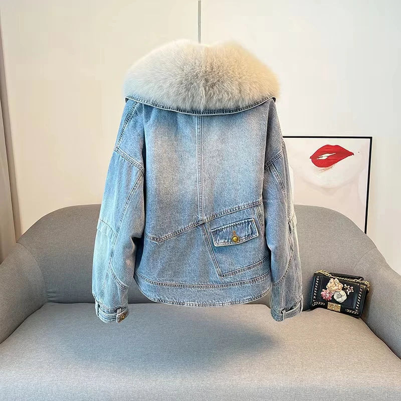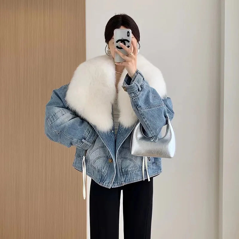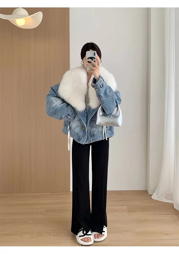 Luxury Women's Fox Fur Collar Goose Down Denim Jacket