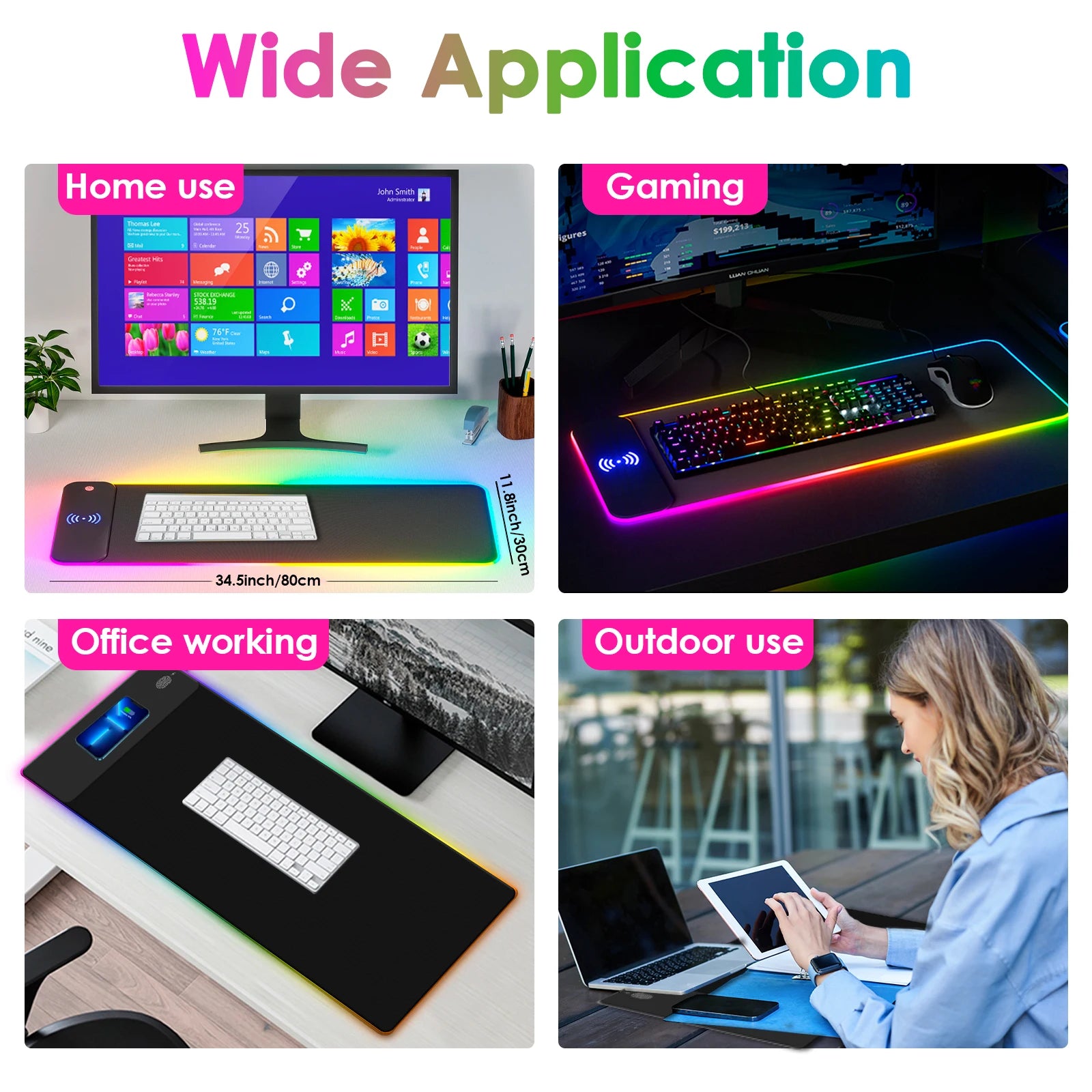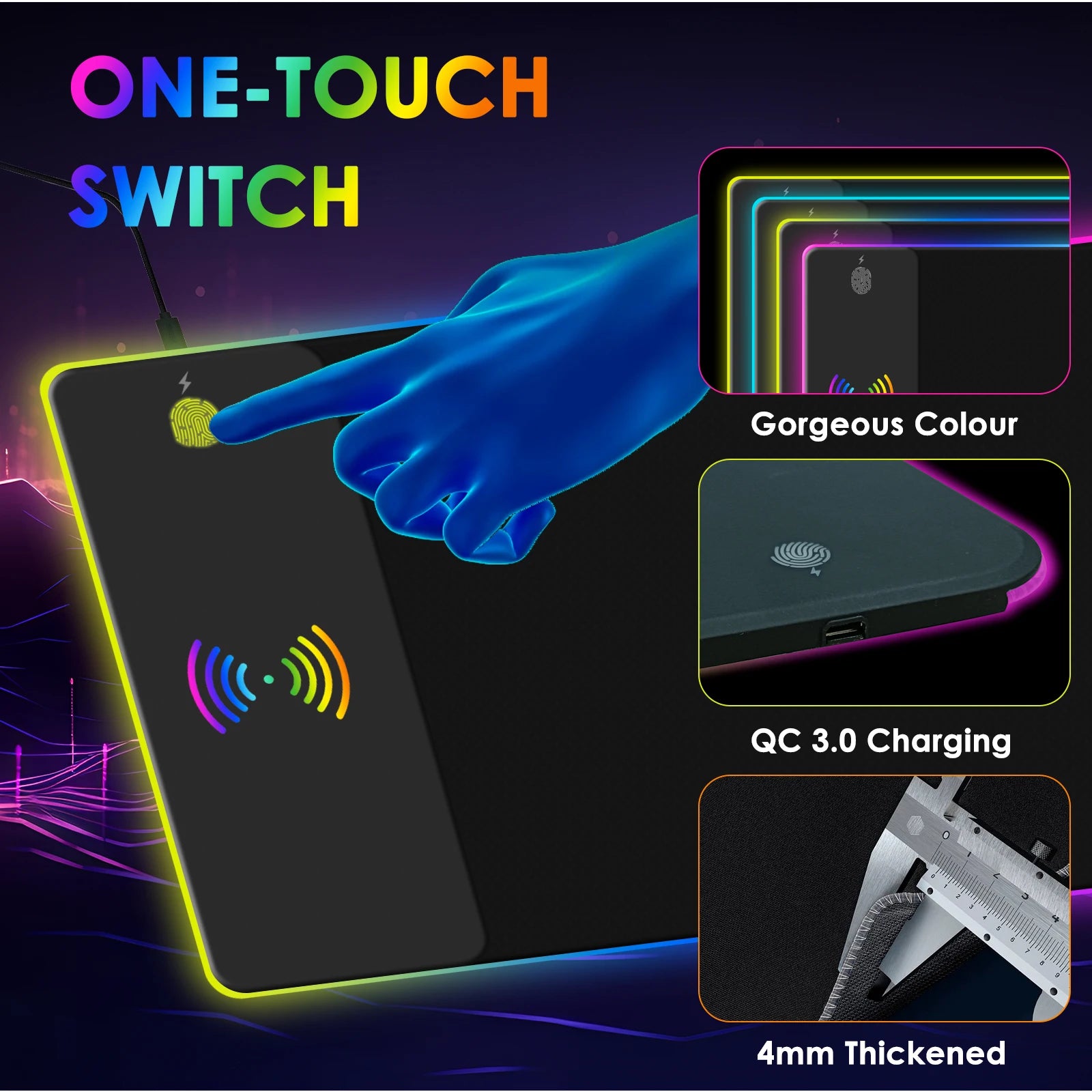 Elevate your gaming or workspace with this RGB Wireless Charging Mouse Pad, designed for both functionality and style. Featuring vibrant RGB lighting modes, this sleek black mouse pad adds atmosphere to your setup, while the smooth surface provides precision for both optical and laser mice.
