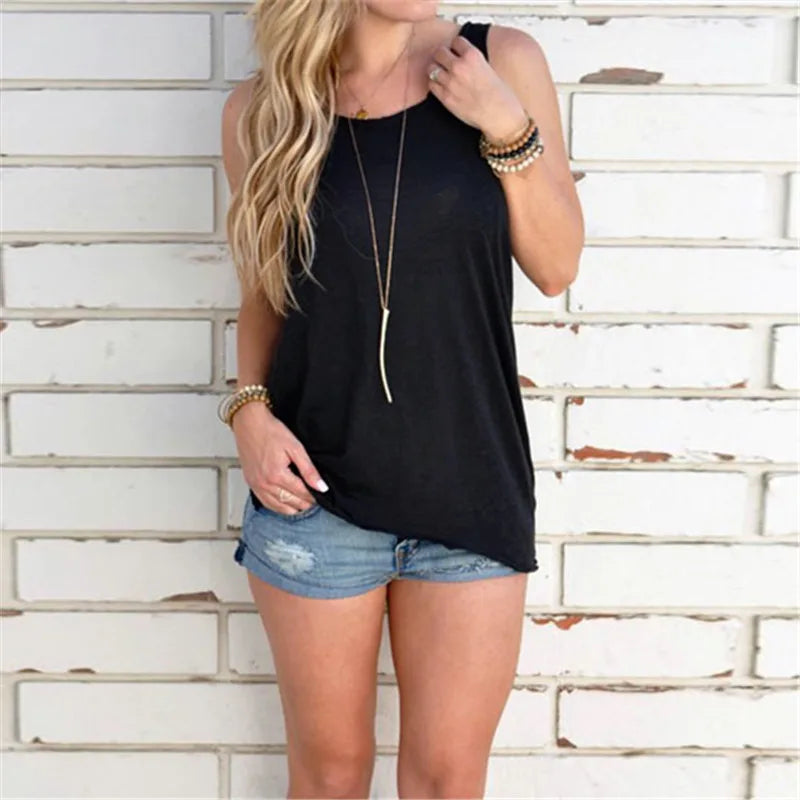 This plus-size sleeveless T-shirt flatters all body types, offering the perfect balance between a relaxed fit and chic appeal. Pair it with your favorite denim shorts, leggings, or skirts for a look that transitions seamlessly from day to night. Whether you're lounging or on the go, this top ensures you stay stylish and comfortable.