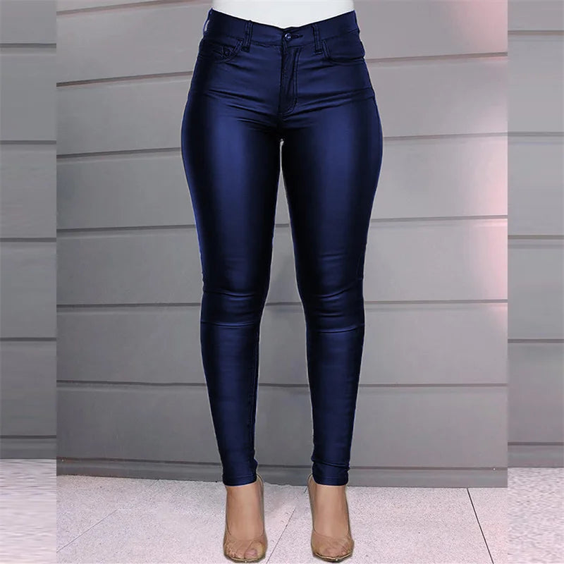 Elevate your wardrobe with these solid color PU leather pants for women, designed to offer a sleek, stylish look. Featuring a slim fit and pencil trousers silhouette, these pants hug your curves for a flattering, modern look. The high waist design elongates the legs and enhances your shape, while the button splicing detail adds a chic touch of sophistication. Perfect for casual commutes, workdays, or a night out, these pants offer versatility and fashion-forward appeal.