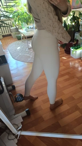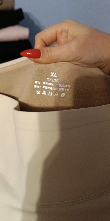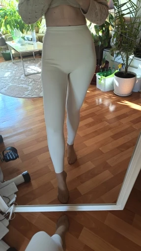 Very thick and beautiful fabric. The waistband is not very elastic. Warm enough for temperatures up to 0C. On mine from 64 cm about 94 cm of copper close to. Well drawn in. But when a little swelling, they press at the waist and top of the legs. So you need to monitor your shape if you want tight-fitting leggings. I think that a size larger would have given a little folds in the groin area. The bottom is not processed, but it is OK. Milk color, closer to ivory. Satisfied with the purchase.