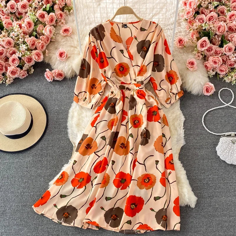 Stay effortlessly elegant this summer in the Women's V-Neck Floral Chiffon Midi Dress – a charming blend of vintage-inspired design and modern Korean style. Crafted from lightweight, breathable chiffon, this dress features a flattering V-neckline, delicate ruffle sleeves, and a flowy midi-length hem perfect for warm-weather occasions. The elastic high waist cinches gently to accentuate your silhouette while providing all-day comfort.
