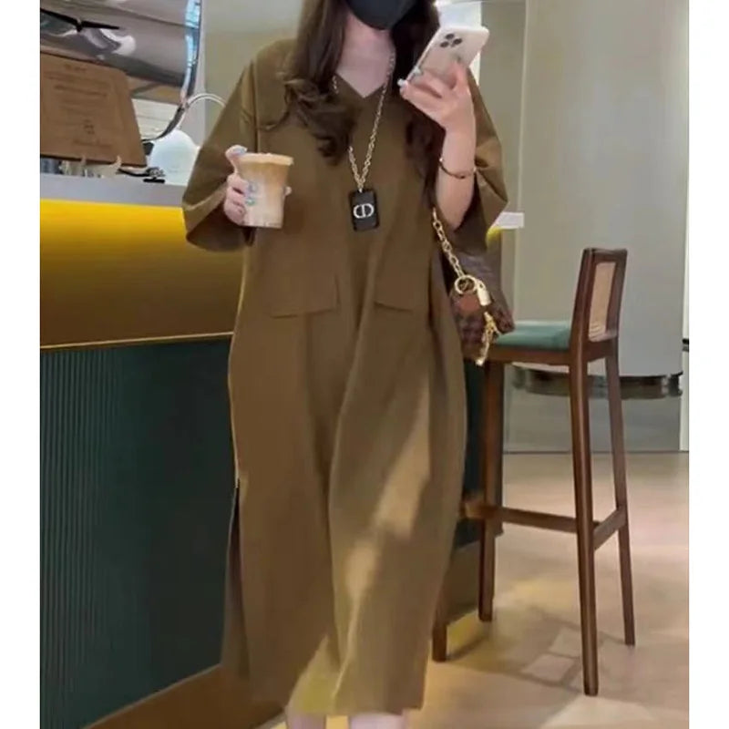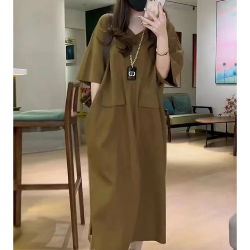 Women's Oversized V-Neck Korean Summer Dress with Pockets